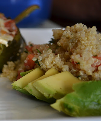 First of all, these are not the deep fried, egg laden chile rellenos you may find in the local taco shop. These are quite literally "filled chiles" -- filled with veggie-meat goodness, that is!